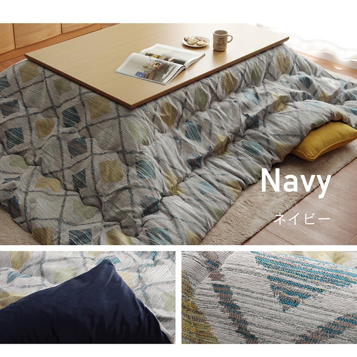 シェニール織りでかすれたビンテージ感を表現し、現代の家具にも合わせやすいこたつ布団。表地はシェニール織りの暖かみある凹凸感ある生地を使用し、裏地にはなめらかな肌触りの短毛マイクロ生地を使用しています。たっぷり入った東レマッシュロン綿がふかふかとした弾力性と保温性を高め、「軽くて暖かい」を実現しました。ふっくらとしたボリューム感は国内で綿入加工をしている商品だからできる仕上がり。1枚1枚丁寧に仕上げた安心の品質です。