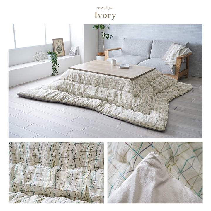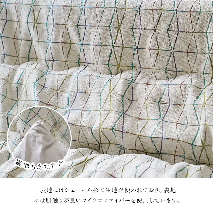 多色の色糸を使い、シンプルながらひと手間加えたデザインのこたつ布団です。表地にはシェニール糸を使用した生地を使用しています。裏地には肌触りが良いマイクロファイバーを使用しています。中綿には弾力性と保温性の高い東レマッシュロン綿を使用しているため軽くて暖かいです。部分暖房のこたつは電気代もおトクです。