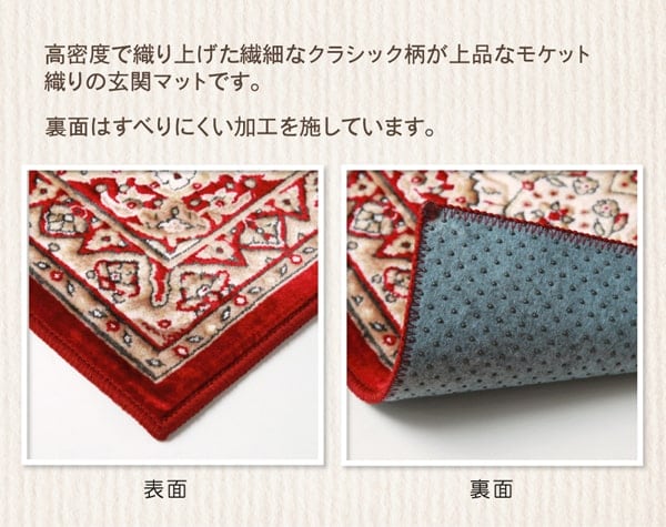 上品なクラシック柄の玄関マットです。高密度で織り上げることで、丈夫で繊細な柄を表現しました。上品な玄関を演出してくれます。あがり框サイズまである他サイズ展開商品です。裏面にはすべりにくい加工を施しています。